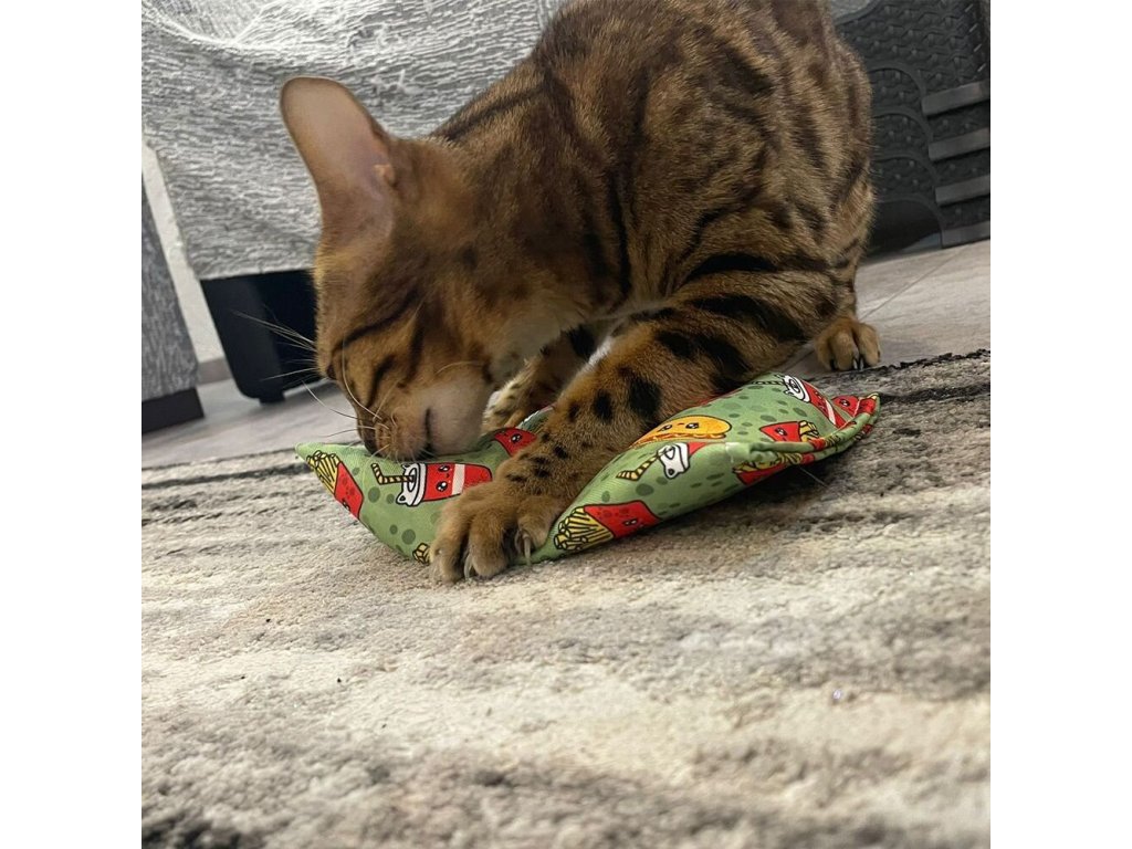 Díky své praktické velikosti a nízké hmotnosti je polštářek vhodný jak pro velké kočky, tak i pro ta nejmenší koťátka, která jej bez námahy zvládnou chytit do tlapek a hrát si s ním.