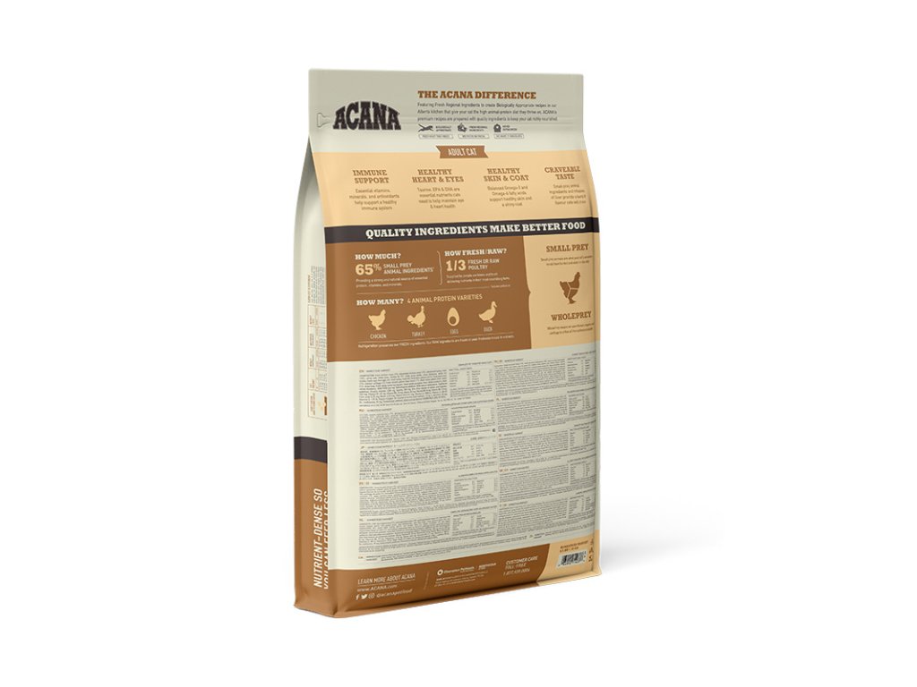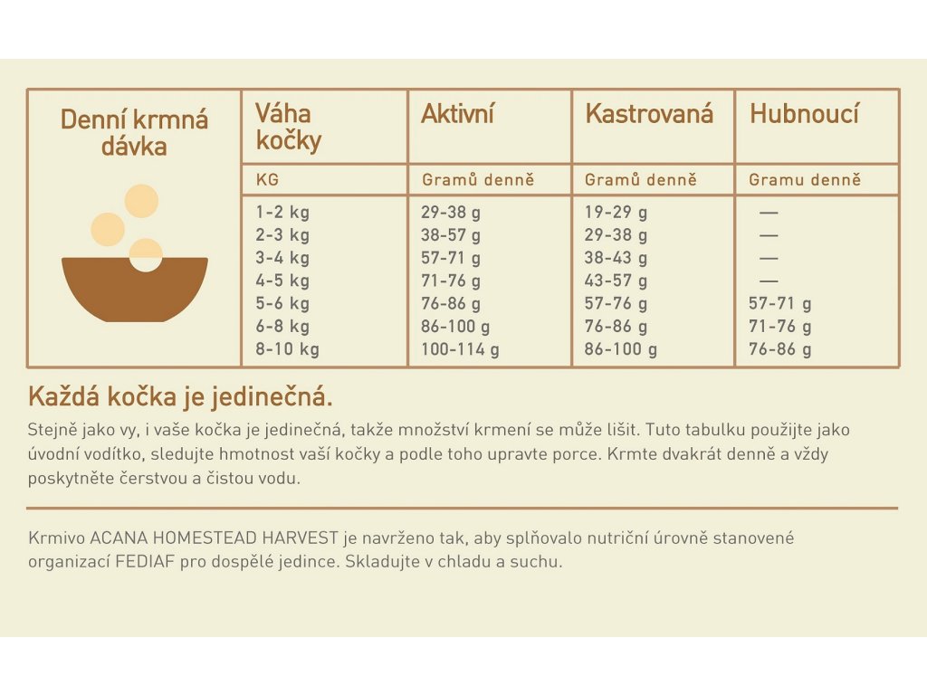 Udělejte radost vaší kočce touto skvělou recepturou plnou živočišných surovin. NOVINKA ACANA Homestead Harvest je nabitá kvalitními ingrediencemi včetně volně chovaného kuřete, krůty a kachny v bohatě vyživujícím poměru celé kořisti (maso, orgány, chrupavky a kosti). Tak získává vaše kočka přirozeně potřebné živiny, které ji udržují šťastnou, zdravou a silnou.
