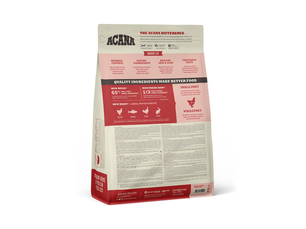 Maso je vždy naší ingrediencí č. 1. Nová receptura ACANA INDOOR ENTRÉE je plná volně chovaného kuřete a krůt, doplněná o lahodného králíka. To vše v poměru celé kořisti (maso, orgány, chrupavky a kosti), který přirozeně vyživuje vaši kočku. Díky krmivu ACANA Indoor Entrée poskytnete kočce všechny živiny, které potřebuje.