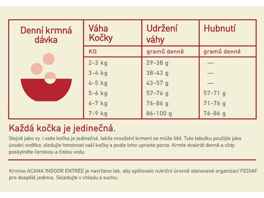 Maso je vždy naší ingrediencí č. 1. Nová receptura ACANA INDOOR ENTRÉE je plná volně chovaného kuřete a krůt, doplněná o lahodného králíka. To vše v poměru celé kořisti (maso, orgány, chrupavky a kosti), který přirozeně vyživuje vaši kočku. Díky krmivu ACANA Indoor Entrée poskytnete kočce všechny živiny, které potřebuje.