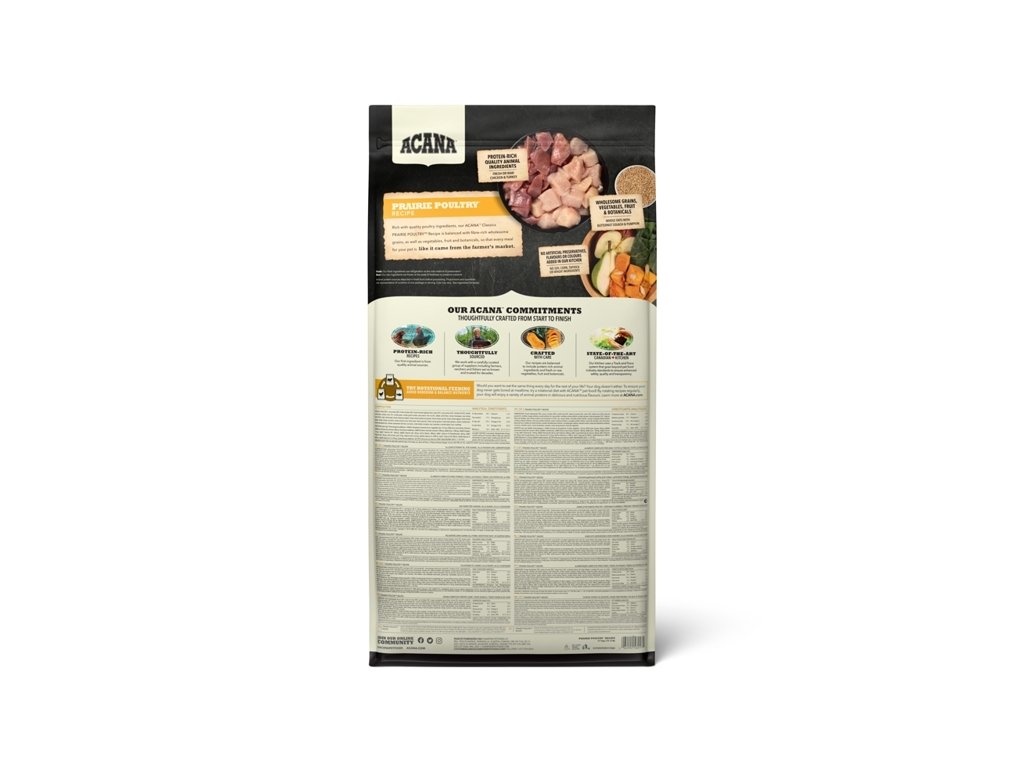 Acana Dog Classics Prairie Poultry je krmivo vhodné pro pejsky každého věku i plemene. Obsahuje maso z volně chovaných kuřat i krůt a vejce z hnizdních chovů. Má velmi rozmanité a bohaté složení a nízkou glykemickou zátěž (neobsahuje vysokoglykemické obiloviny). Kvalitní živočišné proteiny a Omega 3 přispívají k výborné kondici psa.