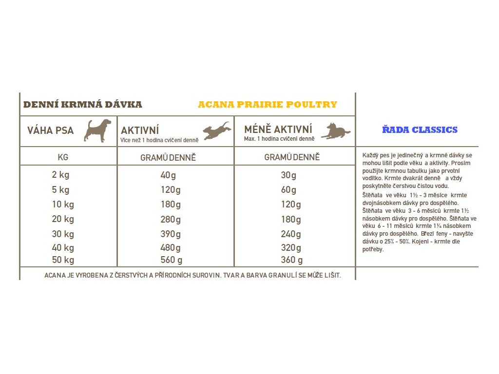 Receptury ACANA® jsou vytvořeny od začátku až do konce s použitím lahodných a kvalitních surovin. Drůbež, výživné ovoce, obiloviny a zelenina v krmivu ACANA Classics Prairie Poultry poskytují vašemu psovi syté a výživné jídlo vyrobené z jednoduchých a zdravých surovin. Obsahuje také ingredience bohaté na živiny, které podporují tři klíčové zdravotní benefity, včetně imunitní funkce, zdravého trávení a zdravé kůže a srsti.