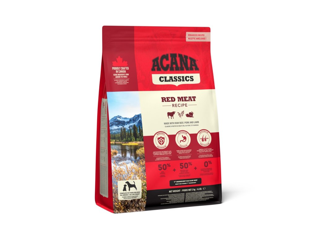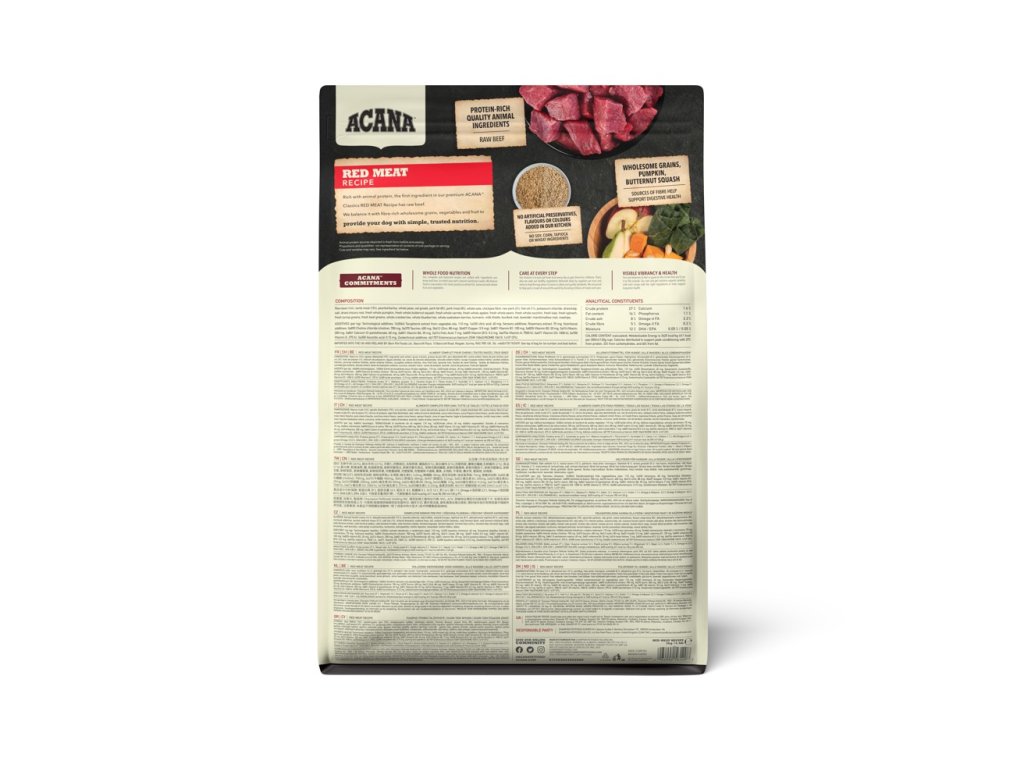Receptury ACANA® jsou vytvořeny od začátku až do konce s použitím lahodných a kvalitních surovin. Červená masa, výživné ovoce, obiloviny a zelenina v krmivu ACANA Classics Red Meat poskytují vašemu psovi syté a výživné jídlo vyrobené z jednoduchých a zdravých surovin. Obsahuje také ingredience bohaté na živiny, které podporují tři klíčové zdravotní benefity, včetně imunitní funkce, zdravého trávení a zdravé kůže a srsti.