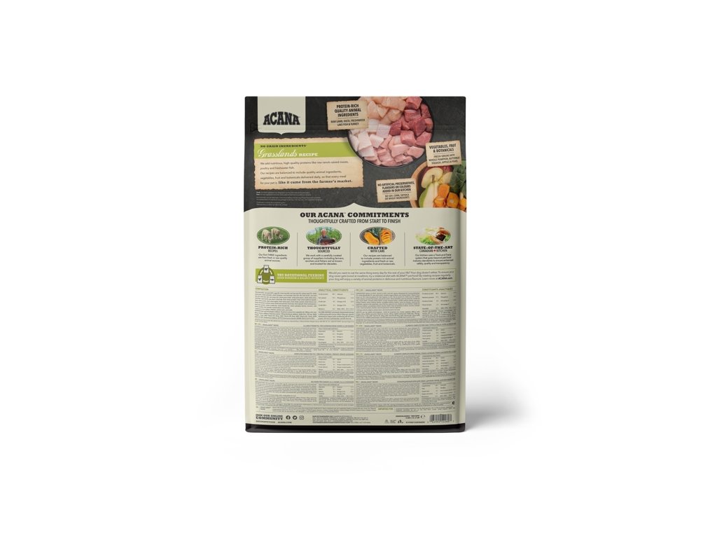 Acana Dog Recipe Grasslands je krmivo vhodné pro psy všech plemen i věku. Granule s nízkým obsahem sacharidů a vysokým obsahem proteinů. Obsahuje jehněčí a kachní maso, vejce a ryby. Zvířata pochází z volného chovu. Receptura je zcela bez obilovin.