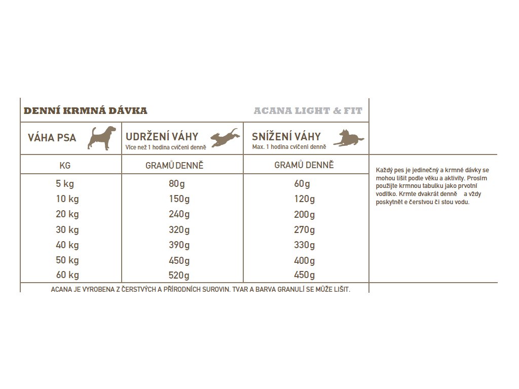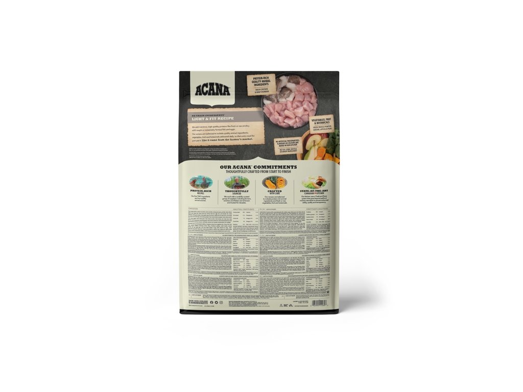 Acana Light & Fit překypuje čerstvými místními surovinami včetně volně chovaných kuřat, vajec z hnízdních chovů, platýse loveného volně v přírodě a na slunci zrajícího ovoce a zeleniny – to vše tvoří stravu se sníženým množstvím sacharidů a kalorií pro optimální kondici dospělých psů. Přečtěte si naše složení a myslíme, že s námi budete souhlasit.