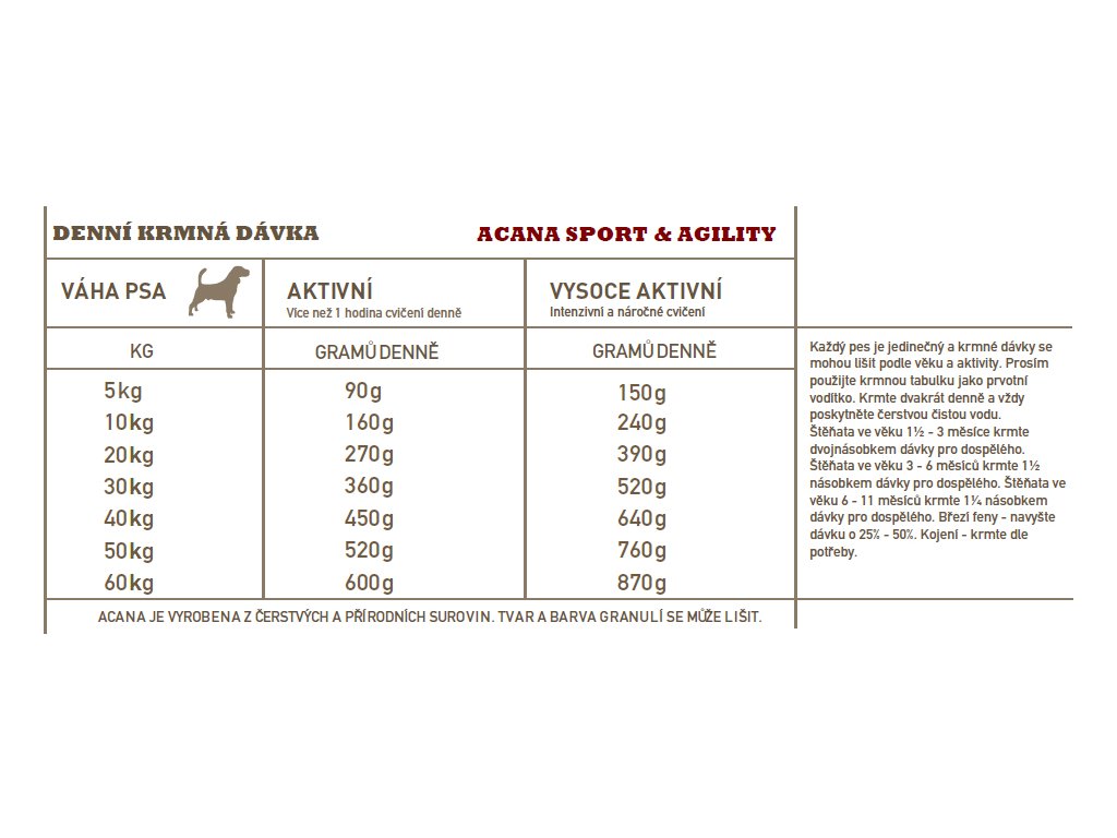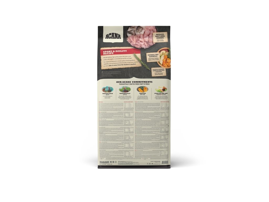 Acana Dog Heritage Sport & Agility je krmivo vhodné pro všechny aktivní psy. Obsahuje kuře, krůtu, vejce a platýse. Ryby jsou volně loveny a kuřata pocházejí z volných chovů.