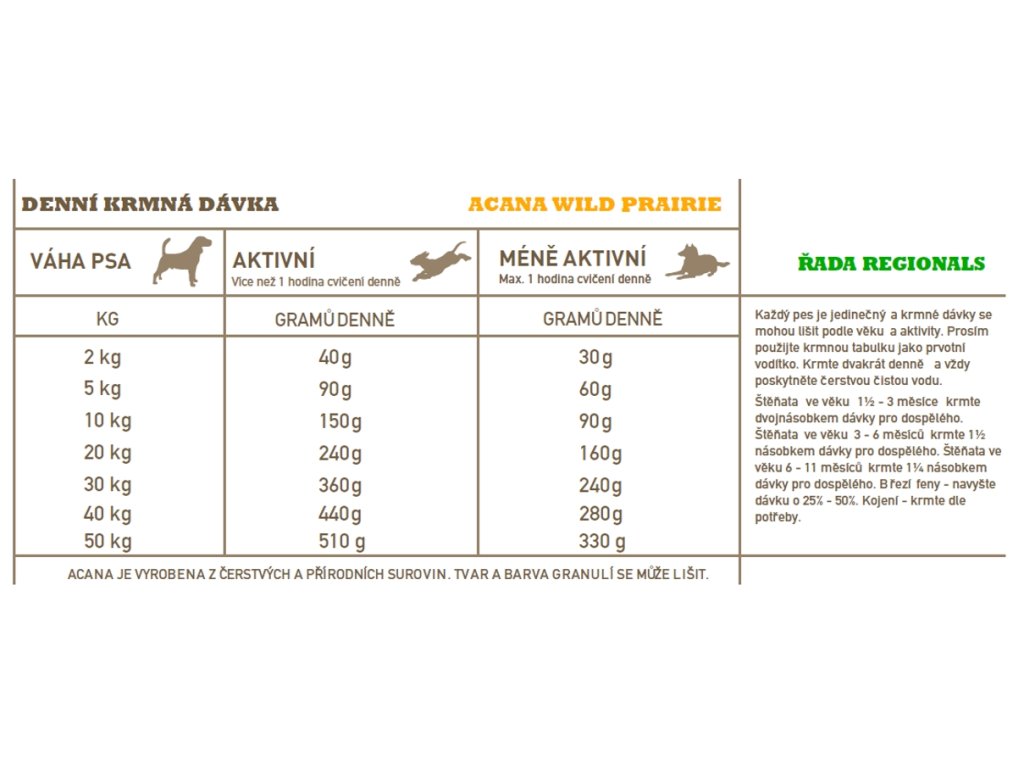 Acana Dog Recipe Wild Prairie je krmivo vhodné pro psy všech plemen i věku. Granule s nízkým obsahem sacharidů a vysokým obsahem proteinů. Obsahuje maso z volně chovaných kuřat a krůt, vejce a volně lovené ryby. Receptura je zcela bez obilnin.