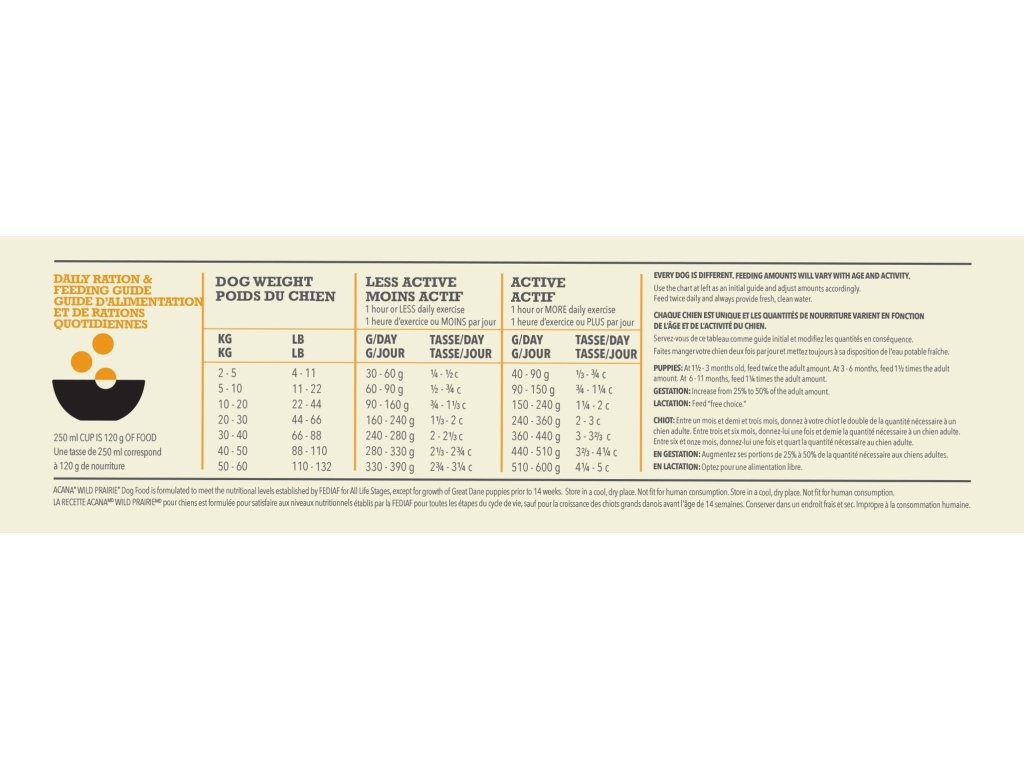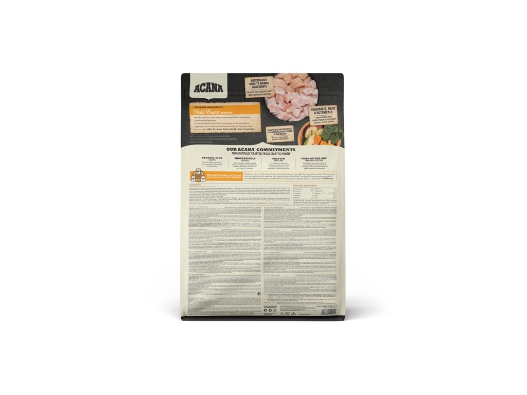 Acana Dog Recipe Wild Prairie je krmivo vhodné pro psy všech plemen i věku. Granule s nízkým obsahem sacharidů a vysokým obsahem proteinů. Obsahuje maso z volně chovaných kuřat a krůt, vejce a volně lovené ryby. Receptura je zcela bez obilnin.