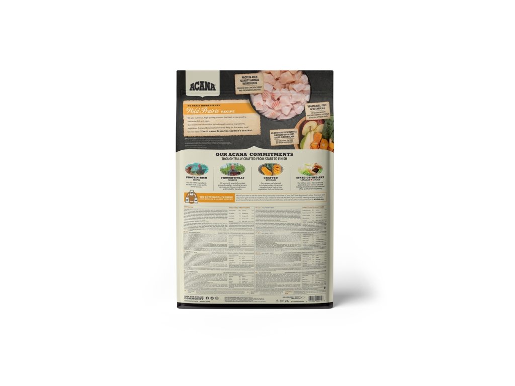 Acana Dog Recipe Wild Prairie je krmivo vhodné pro psy všech plemen i věku. Granule s nízkým obsahem sacharidů a vysokým obsahem proteinů. Obsahuje maso z volně chovaných kuřat a krůt, vejce a volně lovené ryby. Receptura je zcela bez obilnin.