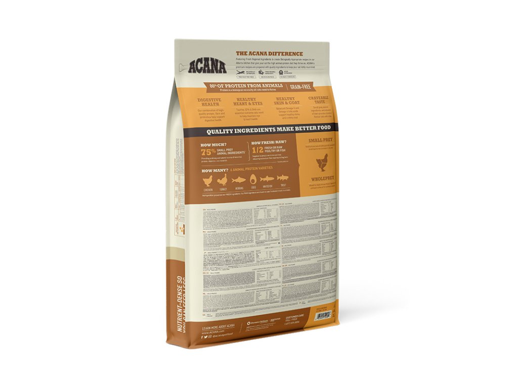 Složení: Čerstvé kuřecí maso (9 %), čerstvé krůtí maso (9 %), čerstvá kuřecí játra (9 %), dehydrované kuřecí maso (8,5 %), dehydrované krůtí maso (8 %), dehydrovaný sleď (8 %), fazole pinto, hrách, kuřecí tuk (6 %), červená čočka, cizrna, zelená čočka, čerstvá vejce z volného chovu (4 %), syrový síh (4 %), syrový pstruh duhový (4 %), čerstvé krůtí droby (játra, srdce) (2 %), vláknina z čočky, olej z tresky (1 %), čerstvá kuřecí srdce (1 %), kuřecí chrupavka (1 %), mrazem sušená kuřecí a krůtí játra (0,5 %), sušená řasa, čerstvá dýně, čerstvá máslová dýně, čerstvá kapusta, čerstvý špenát, čerstvé listy tuřínu, čerstvé mrkve, čerstvá jablka, čerstvé hrušky, čerstvé brusinky, čerstvé borůvky, kořen čekanky, kurkuma, ostropestřec, kořen lopuchu, levandule, kořen ibišku, šípky.
