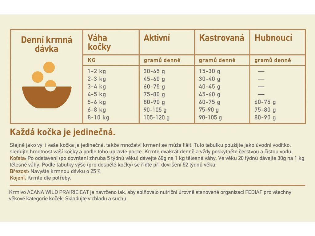 ACANA WILD PRAIRIE CAT GRAIN-FREE - volně chované kuře, krůta a volně lovené ryby 75 % MASA | 1/2 ČERSTVÁ | 80 % ŽIVOČIŠNÝCH BÍLKOVIN Jsme hrdí na to, že vám můžeme představit nové biologicky vhodné receptury ACANA CAT, které jsou zaměřené na přirozenou výživu koček jako masožravců. Naše nové receptury jsou vysokoproteinové, bezobilné a perfektně splňují nejvyšší výživové standardy pro kočky v jakémkoli věku. Malé kořisti jako jsou kuře, krůta a volně lovené ryby jsou přesně to, co by předchůdci vaší kočky jedli ve volné přírodě. Všechna naše krmiva jsou vyráběna metodou "celá kořist". Celá kořist znamená, že používáme maso, orgány, chrupavky a kosti v přirozeném poměru, abychom byli schopni poskytnout všechny důležité živiny přirozenou cestou. Výhody:
