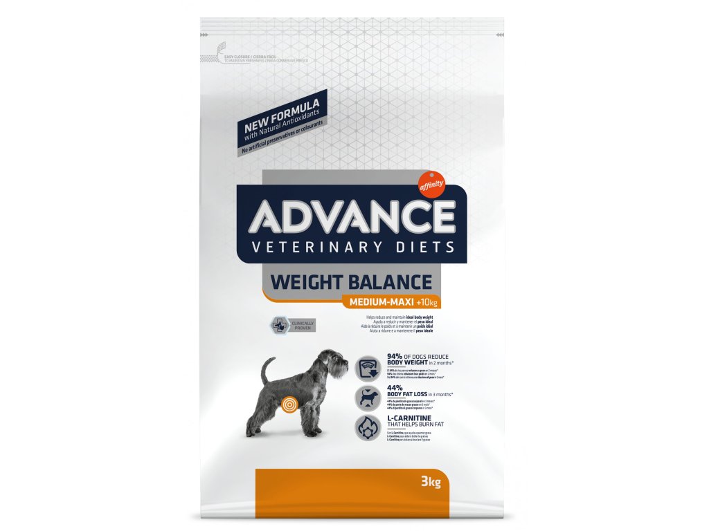 Speciální dietní krmivo pro dospělé psy středních a velkých plemen navržené tak, aby snížilo nadváhu a regulovalo metabolismus lipidů v případě hyperlipidémie. Má nízký obsah energie, nízký obsah tuků a vysoký obsah esenciálních mastných kyselin. U ADVANCE VETERINÁRNÍ DIETY WEIGHT BALANCE MEDIUM/MAXI je klinicky prokázáno, že 94 % psů zhublo za 2 měsíce.
