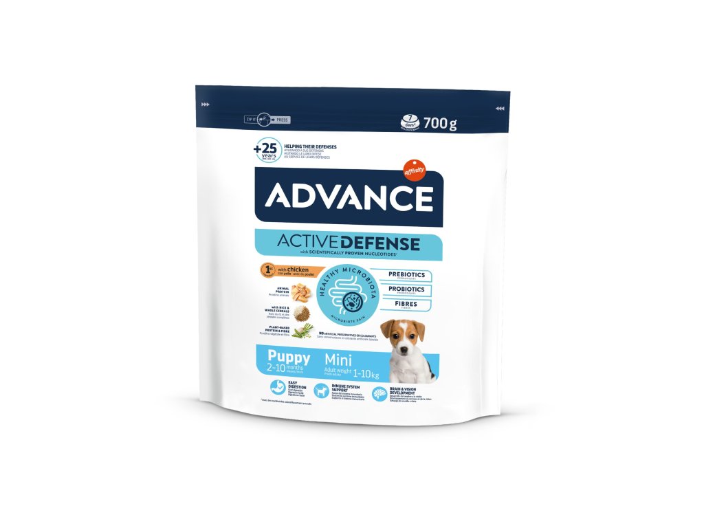 Krmivo Advance Puppy Mini je speciálně vyvinuto tak, aby splňovalo nutriční potřeby štěňat. Krmivo je lehce stravitelné a díky omega 3 mastným kyselinám, vitamínům a minerálům přispívá k normálnímu vývoji mozku a zraku a k optimálnímu růstu kostí štěněte. Součástí jsou nukleotidy, které pomáhají udržovat přirozenou imunitní reakci. Granule jsou menší velikosti, aby se vešly do tlamy malého štěněte.