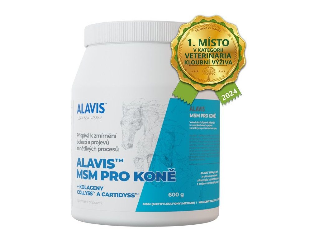 ALAVIS™ MSM pro koně má prokázané analgetické (bolest tišící) a antiflogistické (protizánětlivé)účinky. Snižuje produkci mediátorů zánětu, napomáhá zlepšení fyzické kondice, zpevňuje vazy a šlachy, chrání namáhané klouby a zlepšuje jejich funkci. Při užívání přípravku ALAVIS™ MSM bylo zjištěno lepší hojení ran, proto je vhodné ho užívat u poúrazových a pooperačních stavů.