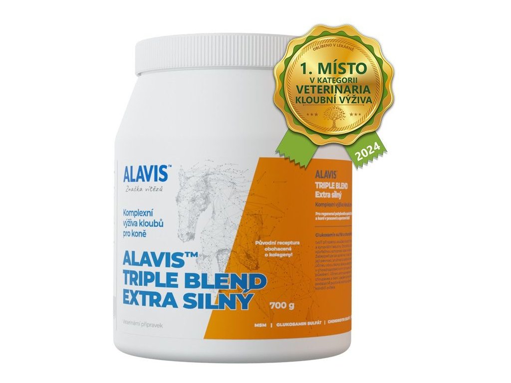 ALAVIS™ Triple Blend Extra Silný obsahuje kombinaci chondroprotektivních látek (glukosamin sulfátu a chondroitin sulfátu), látky MSM a značkových kolagenů Collyss a Cartidyss. ALAVIS™ Triple Blend Extra Silný je vhodný pro regeneraci pohybového aparátu, zejména pro preventivní podávání u hříbat a koní v pracovní a sportovní zátěži.