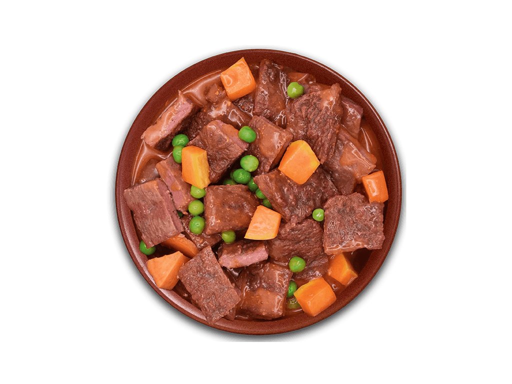 Složení:97% čerstvého hovězího masa v omáčce, sladké brambory, hrášek, mrkev, koření.