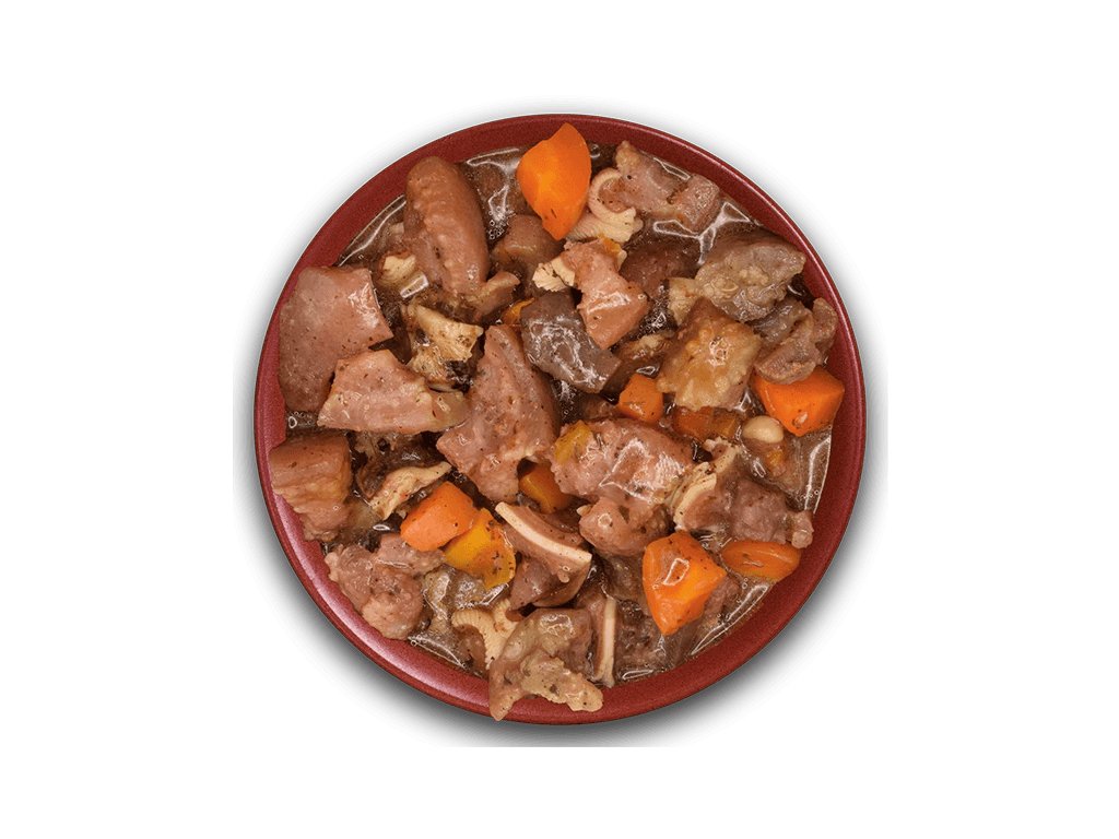 Složení:97% čerstvé vepřové maso v omáčce, hrášek, mrkev, sladké brambory, koření.