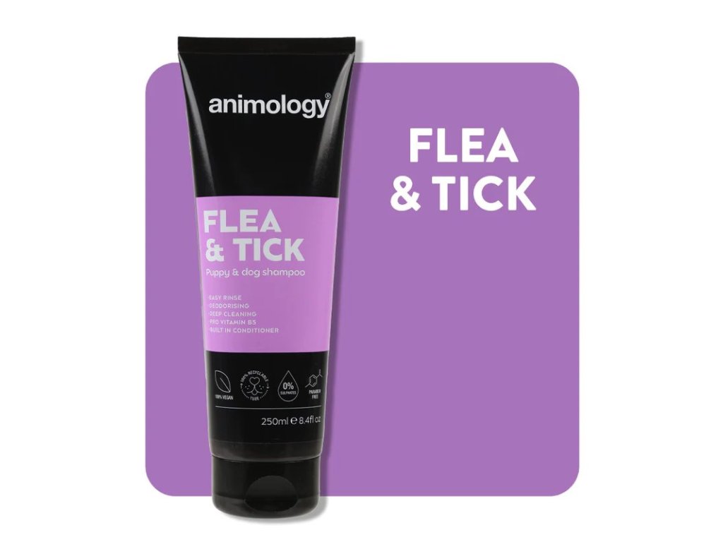 Šampon Animology Flea & Tick je určen pro péči o srst pro dospělé psy a štěňata od 12 týdnů během sezóny klíšťat a blech. Díky obsahu čajovníkového a nimbového oleje účinně odpuzuje klíšťata a blechy. Jeho složení ztěžuje parazitům se do srsti dostat a udržet se v ní. Šampon také velmi efektivně zklidňuje podrážděnou kůži psa. Je jemně pěnivý pro rychlejší opláchnutí srsti.