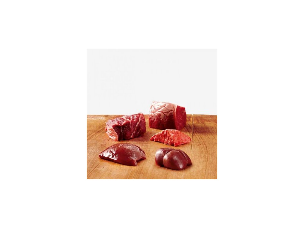 Složení: 68 % hovězí maso (srdce, plíce, maso, játra, vemeno, bachor, ledviny), uličitan vápenatý.