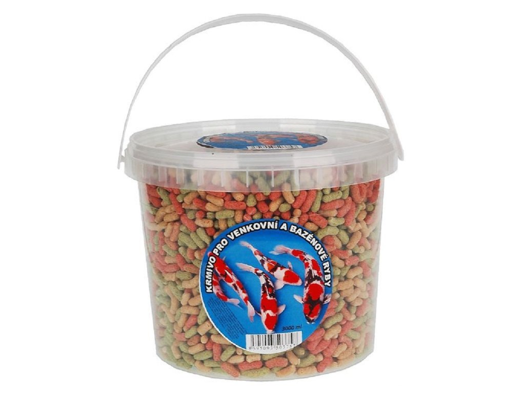 Doplňkové krmivo pro venkovní a bazénové ryby ve formě peletek.