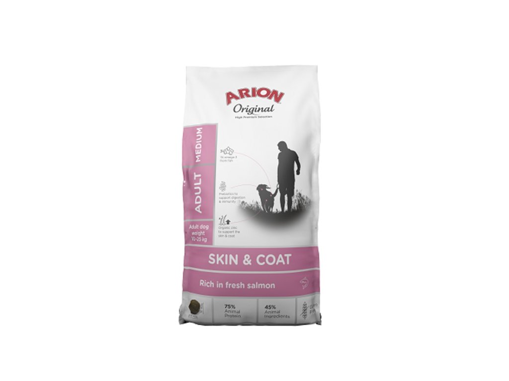 Arion Original Skin & Coat je kompletní krmivo pro dospělé psy středních plemen. Bezlepková receptura na bázi ryb obsahuje unikátní kombinaci mořských surovin a organický zinek na podporu kůže a srsti vašeho psa.