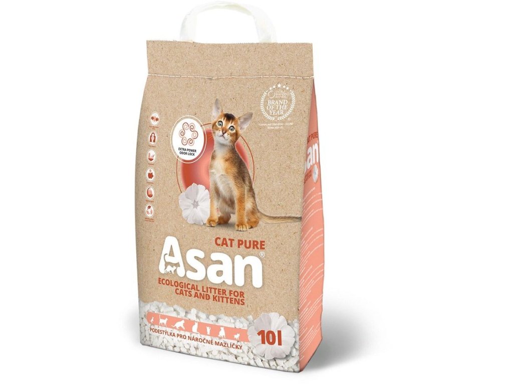 Asan Cat Pure je ekologická podestýlka pro krátkosrsté kočky a fretky s technologií absorpce pachů LAPUR. Nehrudkující stelivo je vhodné pro kočky s tradičními hygienickými návyky. Efektivně absorbuje pachy a prodlužuje tak životnost steliva v toaletě. Stelivo neobsahuje silice, parfémy a přidaná barviva.