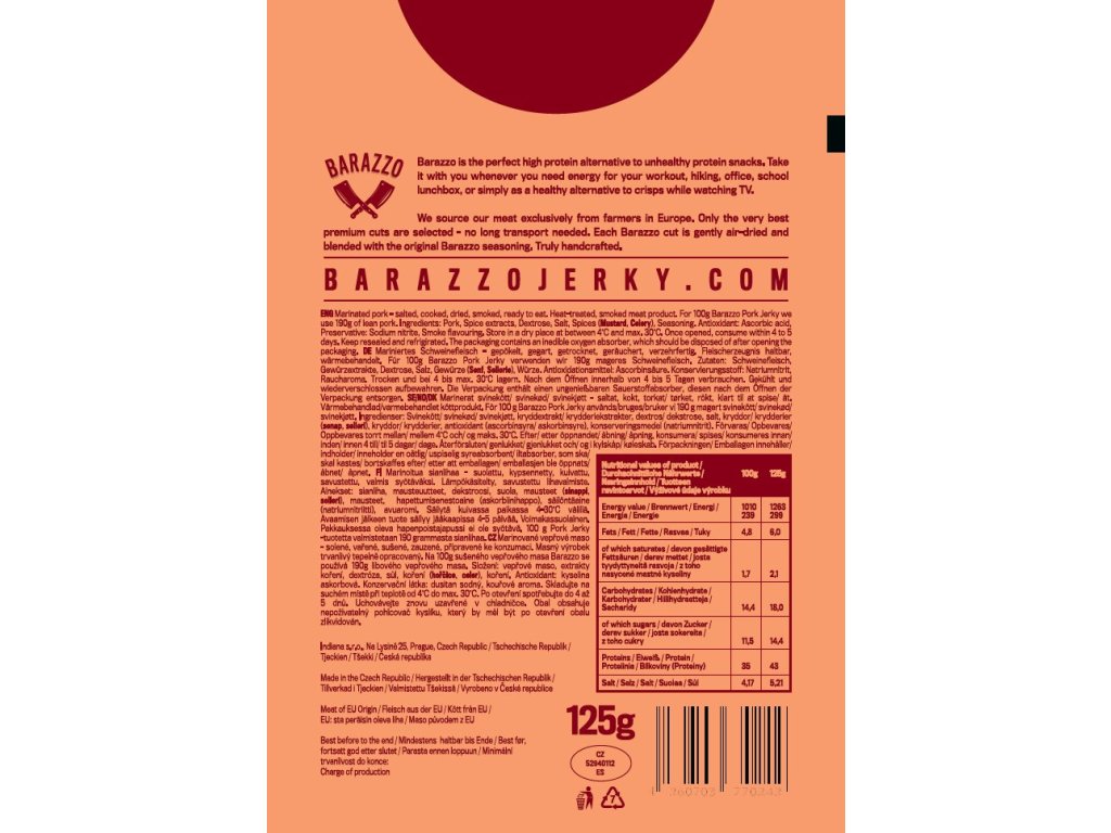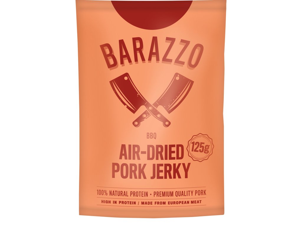 Objevte jedinečný zážitek delikátního sušeného vepřového masa Barazzo! Ručně vybírané prvotřídní kousky vepřového masa, mistrovsky ochucené originální směsí koření Barazzo, nabízí nejen vysoký obsah bílkovin, ale i neuvěřitelnou křehkost, která překonává tradiční sušené hovězí. Nechte se unést jedinečnou chutí a jemností každého kousku, pečlivě vysušeného na vzduchu pro dokonalý zážitek.
