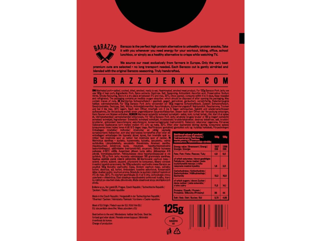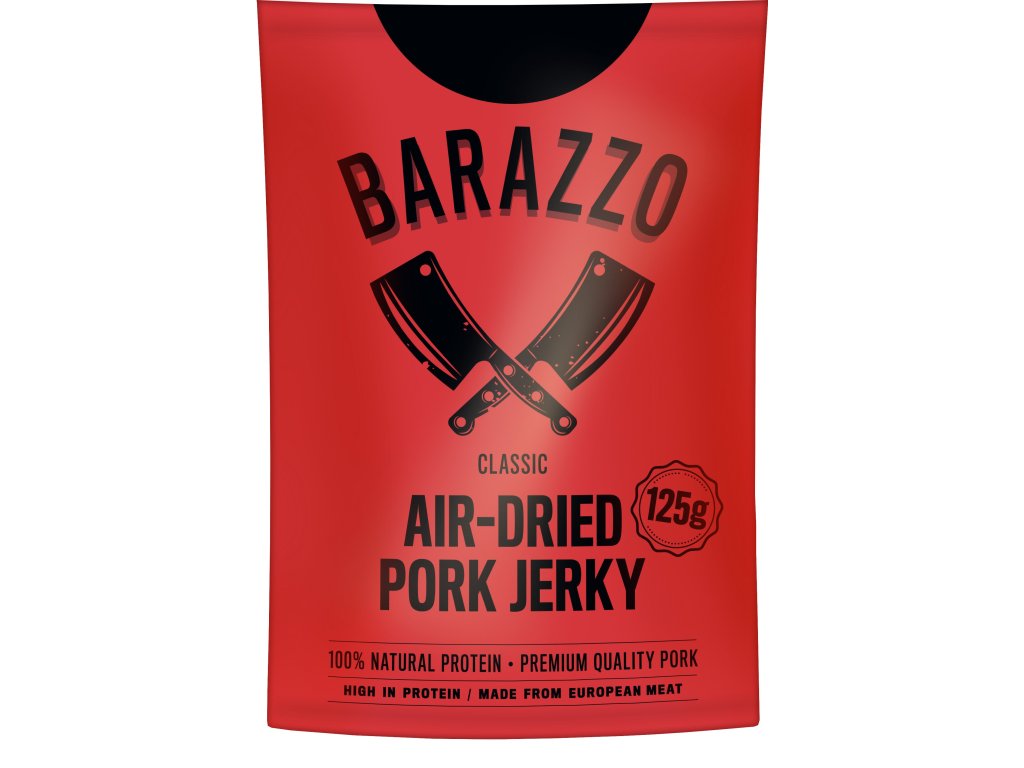Objevte jedinečný zážitek delikátního sušeného vepřového masa Barazzo! Ručně vybírané prvotřídní kousky vepřového masa, mistrovsky ochucené originální směsí koření Barazzo, nabízí nejen vysoký obsah bílkovin, ale i neuvěřitelnou křehkost, která překonává tradiční sušené hovězí. Nechte se unést jedinečnou chutí a jemností každého kousku, pečlivě vysušeného na vzduchu pro dokonalý zážitek.