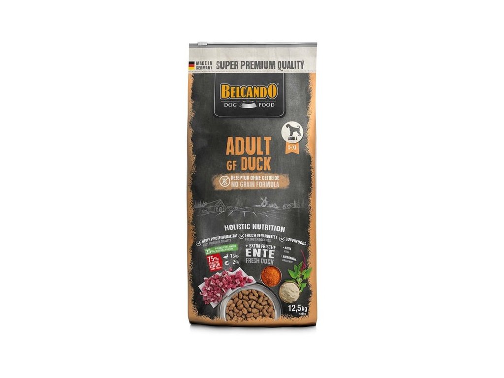 Kachna jako delikatesa – BELCANDO Adult GF Duck Říká se „Kachna dobrá, všechno dobré“ – a u tohoto krmiva to platí dvojnásob! BELCANDO Adult GF Duck je chutné a dobře stravitelné krmivo bez obilovin, které Vašemu psovi dopřeje opravdový gurmánský zážitek. Receptura s extra čerstvým kachním masem a výživnými superpotravinami potěší i citlivější psy. Krill dodává cenné omega-3 mastné kyseliny a další důležité živiny, zatímco amarant slouží jako kvalitní a zdravá náhrada obilovin. Ideální volba pro dospělé psy s vyššími nároky na chuť i výživu! Složení: Čerstvé kachní maso (40 %), kachní protein¹ (18 %), amarant (17 %), bramborový škrob, hrachová mouka, mořský zooplankton (krill)² (2,5 %), výlisky z hroznových jader, pivovarské kvasnice inaktivované¹ (2,5 %), sušený karob¹ (2,5 %), drůbeží tuk, dikalciumfosfát, chia semínka, kvasnice³, sušené řízkované řepné výlisky⁴, chlorid sodný, chlorid draselný, bylinky*¹ (kopřivové listy, kořen hořce, zeměžluč, heřmánek, fenykl, kmín, jmelí, řebříček, ostružinové listy) (0,2 %), yucca schidigera*¹ sušený, *² mletý, *³ hydrolyzované, *⁴ bez cukru Analytické složky:Hrubý protein: 25 %; Obsah tuku: 14 %; Hrubý popel: 7,5 %; Hrubá vláknina: 3,2 %; Vlhkost: 10 %; Vápník: 1,5 %; Fosfor: 1 %; Sodík: 0,3 %
