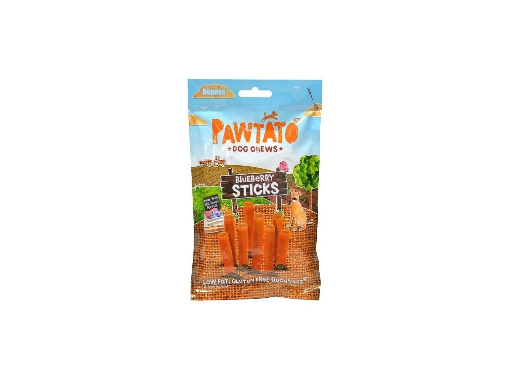 Odměny pro psy Pawtato Sticks Blueberry jsou nízkotučné tyčinky pro pejsky s borůvkovou náplní. Vyrábějí se z organicky vypěstovaných sladkých brambor, přírodních super-potravin plných živin. Benevo Pawtato Sticks jsou vyrobeny bez ryb, bez GMO a jsou v nich skutečné borůvky. Přirozeně bezlepkové, bez sóji, či přidaného cukru, soli, umělých barviv a příchutí.