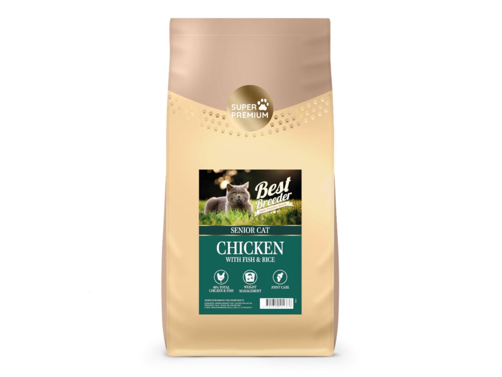 Best Breeder Senior Cat / Light Rich in ChickenToto vysoce kvalitní krmivo má snížený obsah bílkovin a tuků, je tedy vhodné pro stárnoucí kočky a pro obézní nebo kastrované kočky, které potřebují menší příděl energie. Obsahuje celou řadu vitamínů a minerálů, omega 3 a omega 6 mastné kyseliny a také taurin, životně důležitou živinou, kterou si kočičí organizmus nedokáže v dostatečném množství sám vyrobit. Krmiva značky Best Breeder jsou správnou volbou pro každého zodpovědného chovatele koček. Neschovávají se za nejasné složení a obsahují pouze kvalitní suroviny.O tom, že Best Breederu na zdraví vašich domácích mazlíčků opravdu záleží svědčí i to, že do všech produktů přidávají čistě přírodní konzervanty v podobě tuku, tokeferolu a rozmarýnu.