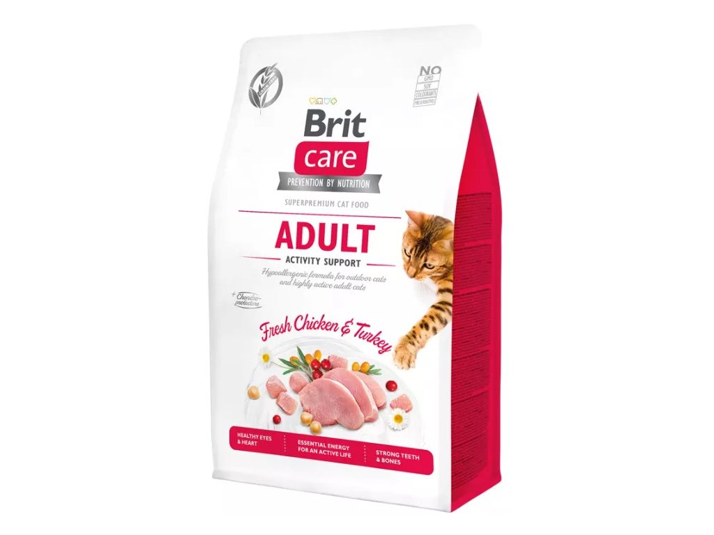 Brit Care Cat Grain-Free Adult Activity Support je kompletní krmivo pro všechny dospělé kočky, které žijí aktivním životem. Receptura bez obilovin obsahuje chondroprotektory a vápník pro zdravé zuby a kosti.