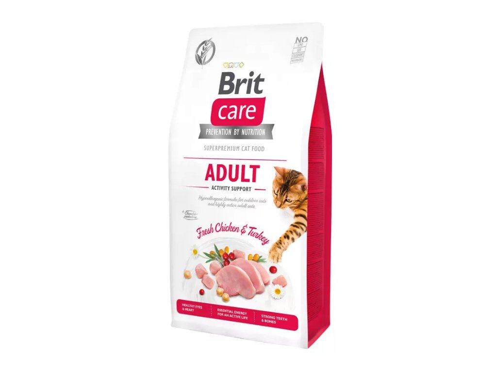 Brit Care Cat Grain-Free Adult Activity Support je kompletní krmivo pro všechny dospělé kočky, které žijí aktivním životem. Receptura bez obilovin obsahuje chondroprotektory a vápník pro zdravé zuby a kosti.