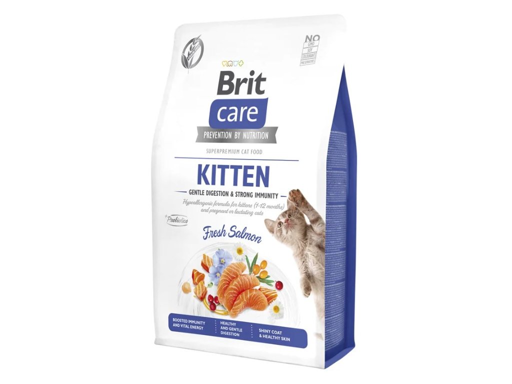 Hypoalergenní krmivo Brit Care Cat Grain-Free Kitten s čerstvým lososem obsahuje vysoký podíl bílkovin a lehce stravitelné suroviny, které zajistí kompletní a vyváženou stravu koťat ve věku 1-12 měsíců a dokonale pokryjí energetické potřeby březích a kojících koček. Bezobilná receptura podporuje správné zažívání a silnou imunitu. Čerstvý losos poskytuje cenné živočišné bílkoviny s vitamínem B6 a B12 a minerály jako niacin, draslík a selen. Losos je navíc bohatý na omega-3 mastné kyseliny DHA a EPA, které pečují o rozvoj mozku a očí, podporují kognitivní vývoj a vitalitu kůže a srsti. Bez obilovin, bez přidaných barviv a konzervantů, bez GMO surovin a bez sóji.