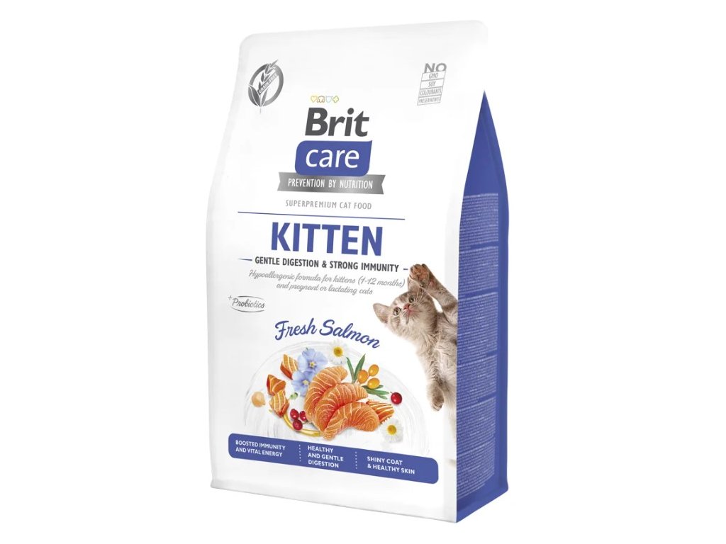Hypoalergenní krmivo Brit Care Cat Grain-Free Kitten s čerstvým lososem obsahuje vysoký podíl bílkovin a lehce stravitelné suroviny, které zajistí kompletní a vyváženou stravu koťat ve věku 1-12 měsíců a dokonale pokryjí energetické potřeby březích a kojících koček. Bezobilná receptura podporuje správné zažívání a silnou imunitu. Čerstvý losos poskytuje cenné živočišné bílkoviny s vitamínem B6 a B12 a minerály jako niacin, draslík a selen. Losos je navíc bohatý na omega-3 mastné kyseliny DHA a EPA, které pečují o rozvoj mozku a očí, podporují kognitivní vývoj a vitalitu kůže a srsti. Bez obilovin, bez přidaných barviv a konzervantů, bez GMO surovin a bez sóji.