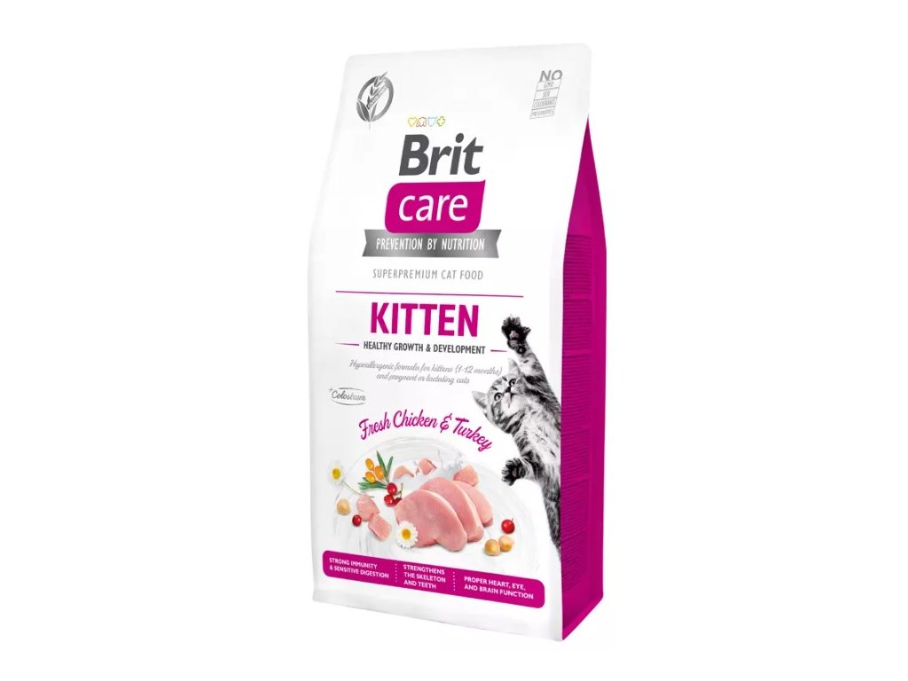 Brit Care Cat Grain-Free Kitten Healthy Growth & Development je kompletní krmivo pro koťata a březí nebo kojící kočky. Tato hypoalergenní receptura obsahuje čerstvé kuřecí a krůtí maso.