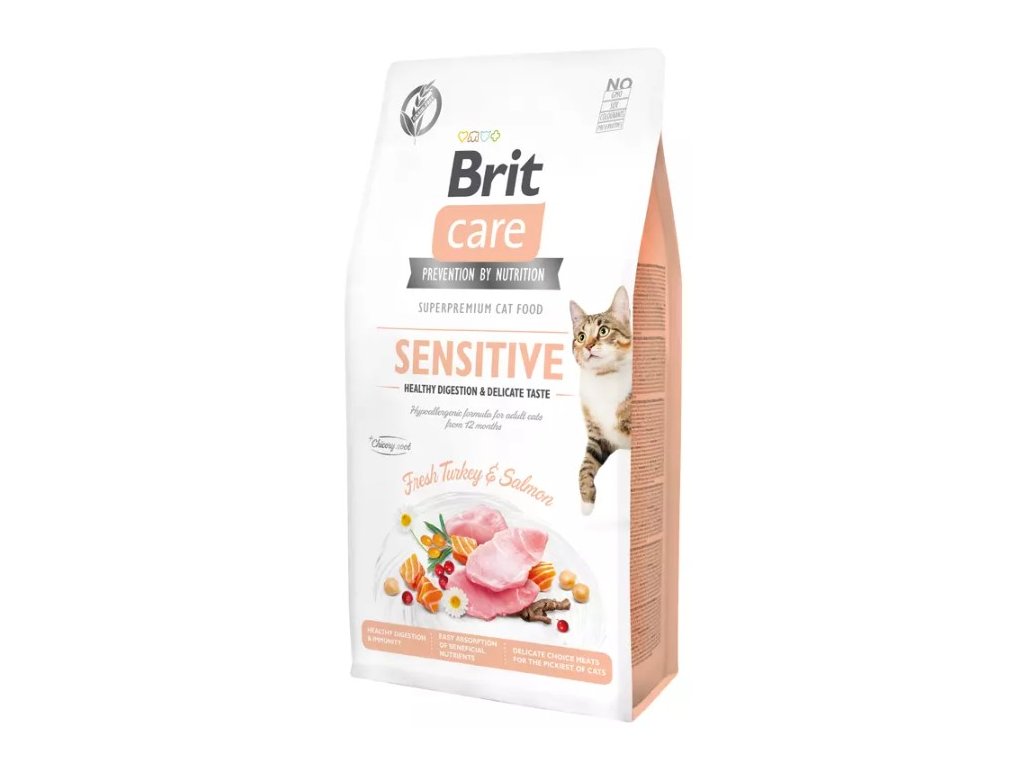 Brit Care Cat Grain-Free Sensitive Healthy Digestion & Delicate Taste je kompletní krmivo pro dospělé kočky s citlivým zažíváním. Hypoalegenní receptura obsahuje čerstvé maso z krůty a lososa.