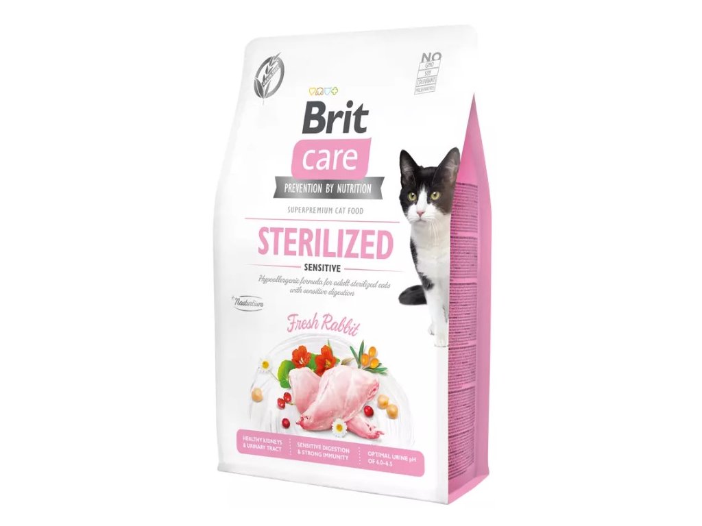 Brit Care Cat Grain-Free Sterilized Sensitive je kompletní krmivo pro kastrované kočky s citlivým zažíváním. Hypoalergenní receptura obsahuje čerstvé králičí maso. Benefity krmiva: