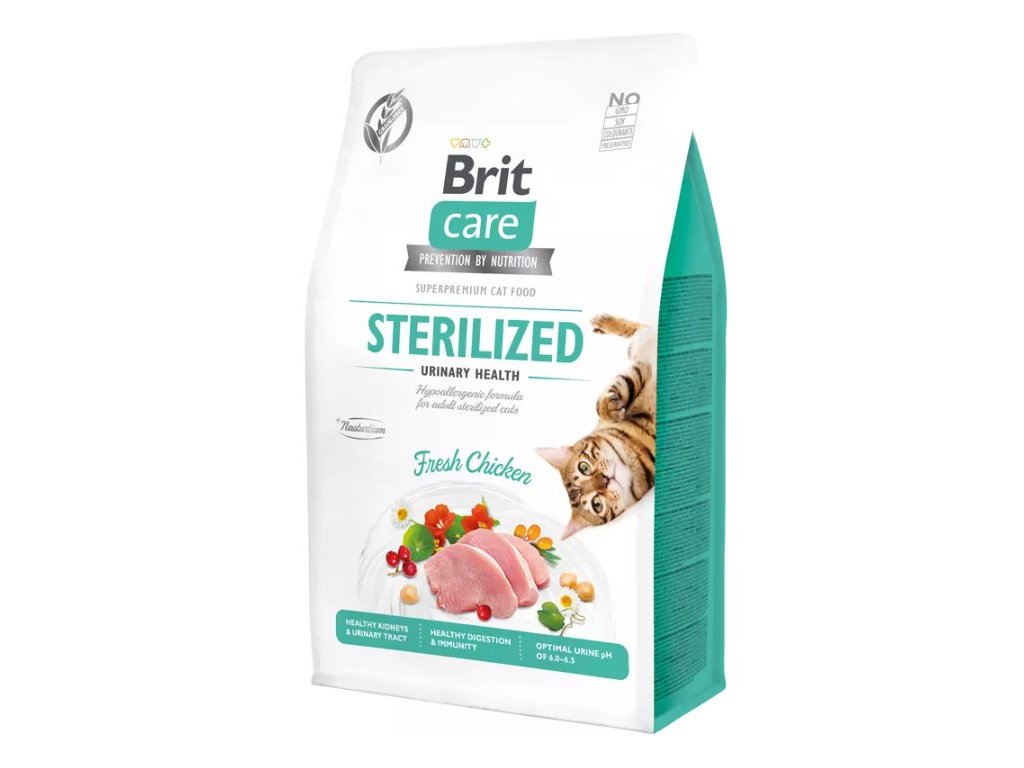 Brit Care Cat Grain-Free Sterilized Urinary Health je kompletní krmivo pro kastrované kočky. Hypoalergenní receptura obsahuje čerstvé kuřecí maso a je zcela bez obsahu obilovin.