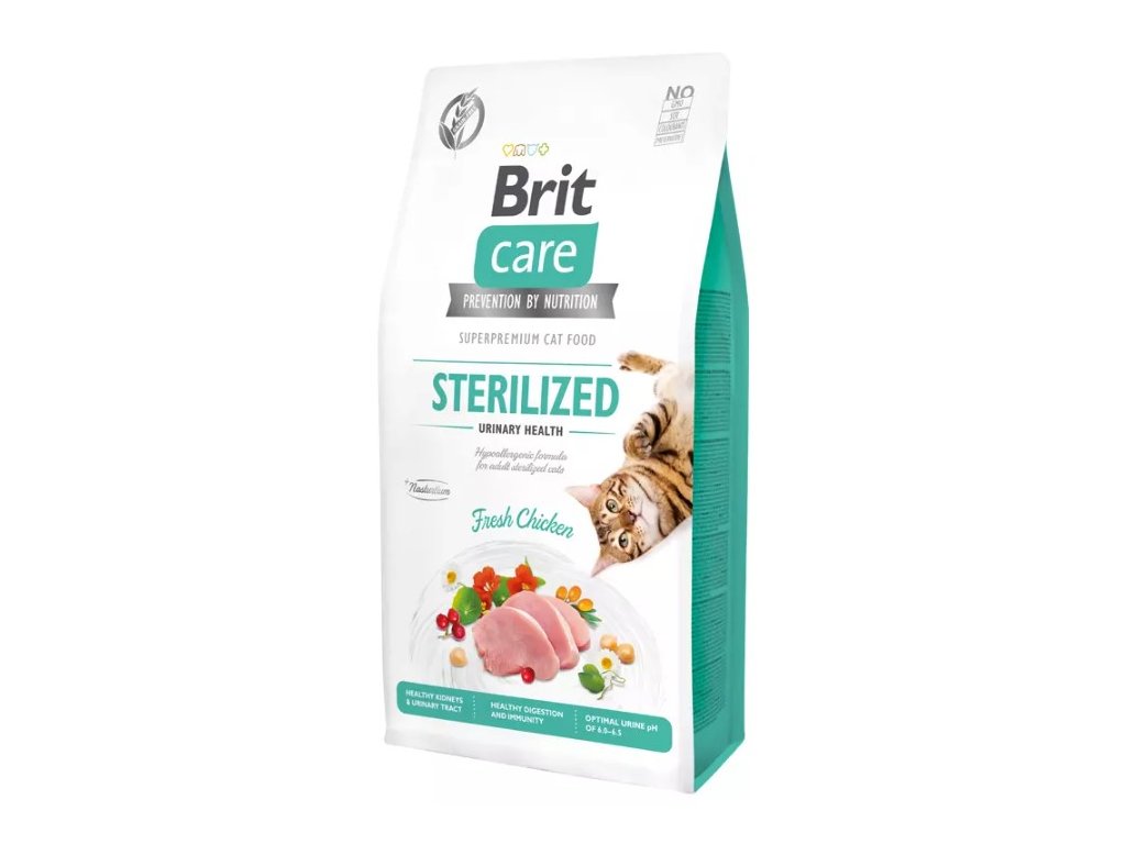 Brit Care Cat Grain-Free Sterilized Urinary Health je kompletní krmivo pro kastrované kočky. Hypoalergenní receptura obsahuje čerstvé kuřecí maso a je zcela bez obsahu obilovin.