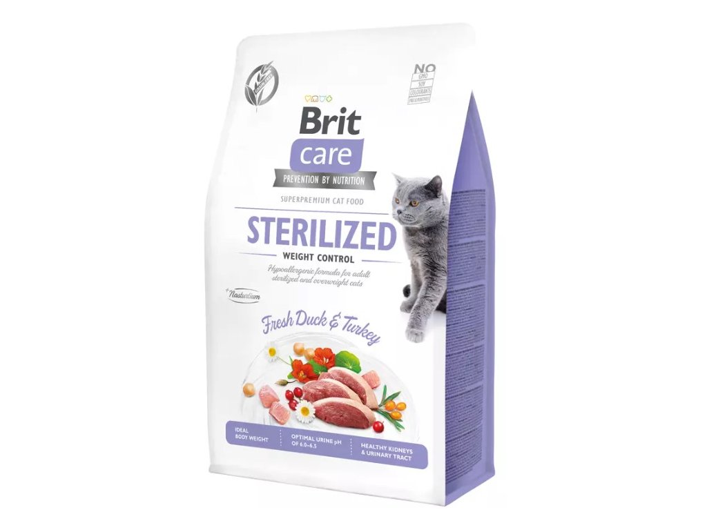 Brit Care Cat Grain-Free Sterilized Weight Control je kompletní krmivo pro kastrované kočky. Receptura obsahuje čerstvé kachní a krůtí maso a je zcela bez obilovin.Benefity krmiva