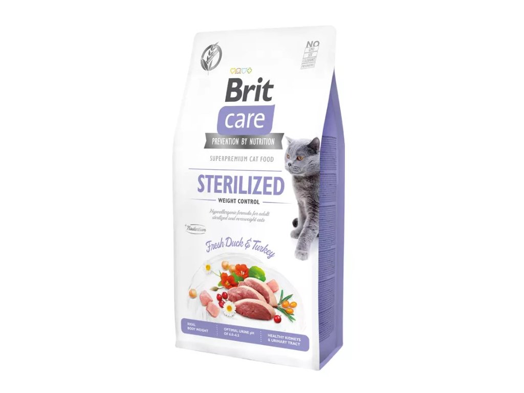 Brit Care Cat Grain-Free Sterilized Weight Control je kompletní krmivo pro kastrované kočky. Receptura obsahuje čerstvé kachní a krůtí maso a je zcela bez obilovin.Benefity krmiva