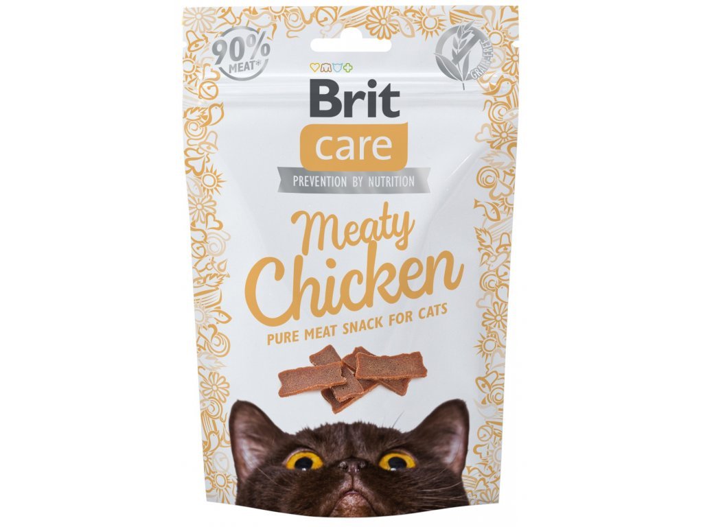 Brit Care Cat Snack Meaty Chicken jsou pamlsky pro kočičky ve formě drobných kousků sušeného kuřecího masa. Pamlsky jsou vyráběny v Evropské unii. Složení neobsahuje obiloviny a je vhodné pro každodenní podávání. Složení:Kuře 86,8 %, škrob 5 %, glycerin 3 %, sorbitol 2 %, hráškový protein 3 %, sůl 0,2 %. Analytické složky:Hrubý protein 35 %, hrubý tuk 5 %, vlhkost 23 %, hrubý popel 4,5 %, hrubá vláknina 0,3 %. Doplňkové látky na 1 kg:Vitamin A (3a672a) 5,000 IU, vitamin D3 (3a671) 500 IU, vitamin E (3a700) 5 mg, taurin (3a370) 1,000 mg. Energetická hodnota:3,030 kcal/kg.