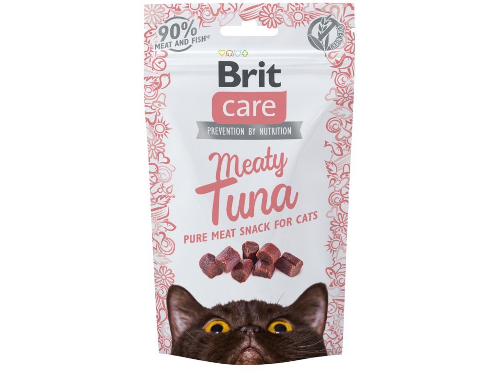 Brit Care Cat Snack Meaty Tuna jsou pamlsky pro kočičky ve formě drobných kousků sušeného masa z tuňáka. Pamlsky jsou vyráběny v Evropské unii. Složení neobsahuje obiloviny a je vhodné pro každodenní podávání. Složení:Tuňák 88,8 %, škrob 3 %, hráškový protein 3 %, glycerin 3 %, sorbitol 2 %, sůl 0,2 %. Analytické složky:Hrubý protein 23 %, hrubý tuk 5 %, vlhkost 23 %, hrubý popel 4 %, hrubá vláknina 0,2 %. Doplňkové látky na 1 kg:Vitamin A (3a672a) 5,000 IU, vitamin D3 (3a671) 500 IU, vitamin E (3a700) 5 mg, taurin (3a370) 1,000 mg. Energetická hodnota:3,050 kcal/kg.