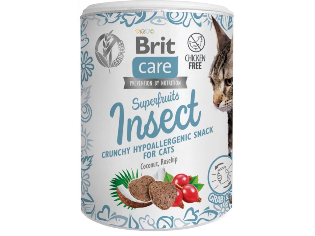 Doplňkové krmivo Brit Care Cat Snack Superfruits Insect bez obilovin pro dospělé kočky. Vhodné pro kočky s potravinovou intolerancí. Křupavý pamlsek s hmyzem a s kokosem a šípkem. Chrastící křupavé pamlsky kočku přilákají a strhnou ke společné zábavě.