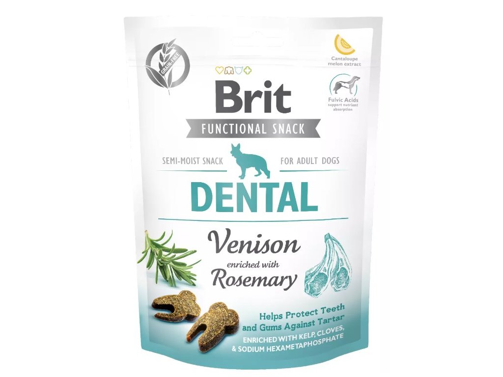 Šťavnaté pamlsky Brit Functional Snack jsou vyrobeny bez obilovin a bez brambor. Poloměkké pamlsky jsou zdravým, masitým a chutným doplňkem stravy pro všechny dospělé psy. Receptura Dental podporuje zdraví ústní dutiny včetně zubů a dásní. Pamlsky Dental působí preventivně proti vzniku zubního kamene. Veškeré funkční pamlsky pro psy Brit jsou obohacené o laktobacily, fulvinové kyseliny a extrakt z cukrového melounu. Fulvinové kyseliny podporují snadné vstřebávání živin z potravin, stabilizují střevní mikroflóru a zvyšují aktivitu imunitního systému. Extrakt z cukrového melounu posyktuje organismu vysoce účinnou ochranu proti volným radikálům.