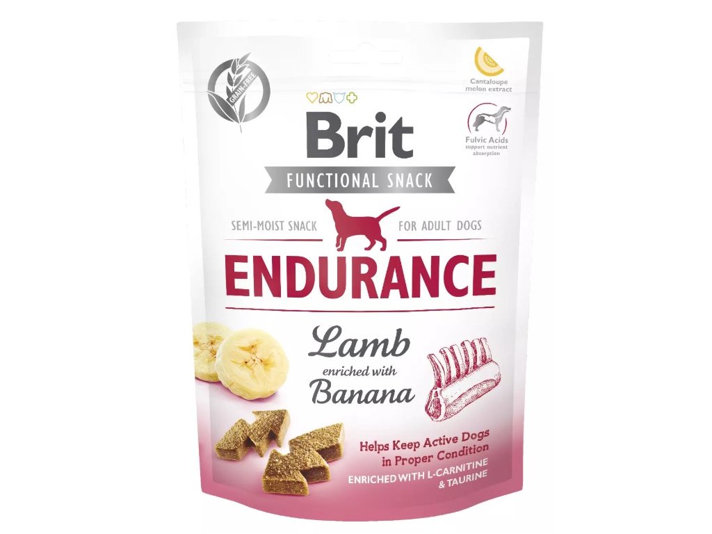 Šťavnaté pamlsky Brit Functional Snack jsou vyrobeny bez obilovin a bez brambor. Poloměkké pamlsky jsou zdravým, masitým a chutným doplňkem stravy pro všechny dospělé psy. Receptura Endurance pomáhá udržet optimální tělesnou kondici aktivního psa. Veškeré funkční pamlsky pro psy Brit jsou obohacené o laktobacily, fulvinové kyseliny a extrakt z cukrového melounu. Fulvinové kyseliny podporují snadné vstřebávání živin z potravin, stabilizují střevní mikroflóru a zvyšují aktivitu imunitního systému. Extrakt z cukrového melounu posyktuje organismu vysoce účinnou ochranu proti volným radikálům.