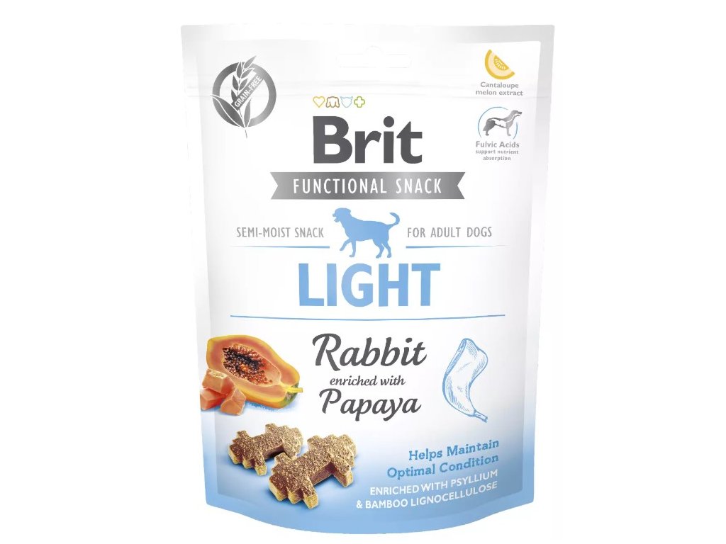 Šťavnaté pamlsky Brit Functional Snack jsou vyrobeny bez obilovin a bez brambor. Poloměkké pamlsky jsou zdravým, masitým a chutným doplňkem stravy pro všechny dospělé psy. Receptura Light pomáhá udržet optimální tělesnou kondici psa. Veškeré funkční pamlsky pro psy Brit jsou obohacené o laktobacily, fulvinové kyseliny a extrakt z cukrového melounu. Fulvinové kyseliny podporují snadné vstřebávání živin z potravin, stabilizují střevní mikroflóru a zvyšují aktivitu imunitního systému. Extrakt z cukrového melounu posyktuje organismu vysoce účinnou ochranu proti volným radikálům.