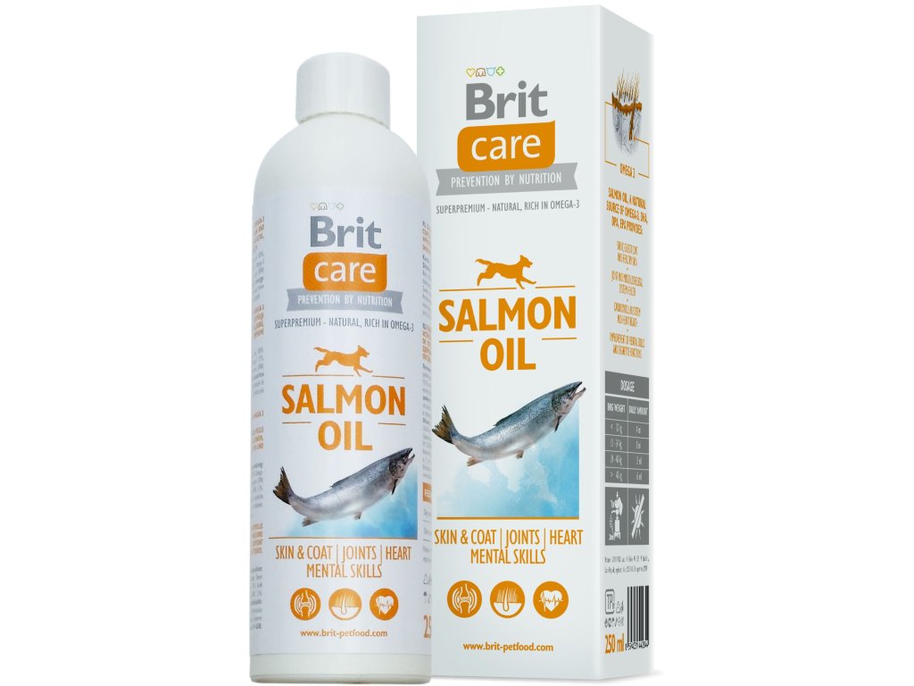 Lososový olej Brit Care je doplňkem výživy pro psy. Je vynikajícím zdrojem Omega 3 mastných kyselin (EPA a DHA), které pozitivně ovlivňují mnoho metabolických pochodů v organismu. EPA kyselina má přírodní protizánětlivé účinky, DHA kyselina se podílí na výstavbě mozkových struktur a sítnice oka. Lososový olej vyrovnává poměr mezi Omega 3 a Omega 6 mastnými kyselinami a významně snížuje hladiny cholesterolu v krvi.
