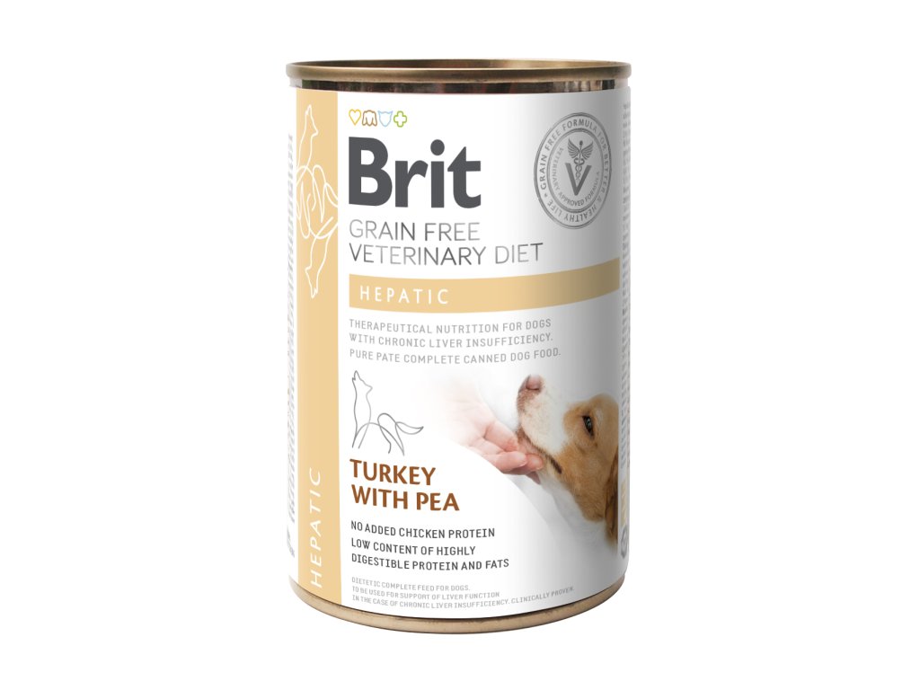 Složení: krůtí maso (55%), zelený hrách (4%), lososový olej (2%), hrachová mouka, lignocelulóza, uhličitan vápenatý, sušená řasa (0.5%, Ascophyllum nodosum), semena ostropestřce mariánského (0.2%), mannan-oligosacharidy (0.005%), frukto-oligosacharidy (0.005%), Juka mohave (0.0034%), β-glukany (0.004%), sušený rakytník řešetlákový (0.003%). Pokyny pro krmení: Užívání Brit VD dietní stravy konzultujte se svým veterinářem – v kombinaci se suchým krmivem Brit VD Dog Grain Free Hepatic denní dávku přiměřeně snižte. Zpočátku podávejte po dobu max. 6 měsíců, před zahájením užívání či prodloužením jeho doby doporučujeme řídit se radami veterináře. Zajistěte, aby měl váš pes nepřetržitě přístup k čerstvé pitné vodě. Krmná tabulka: